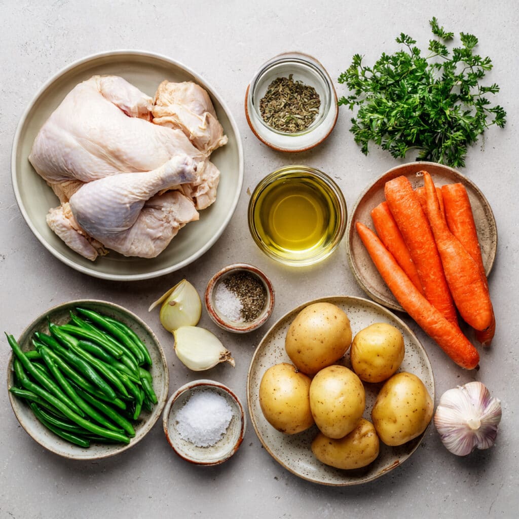 - Assemble the Dish: Add carrots, green beans, potatoes, and pour in chicken broth.
