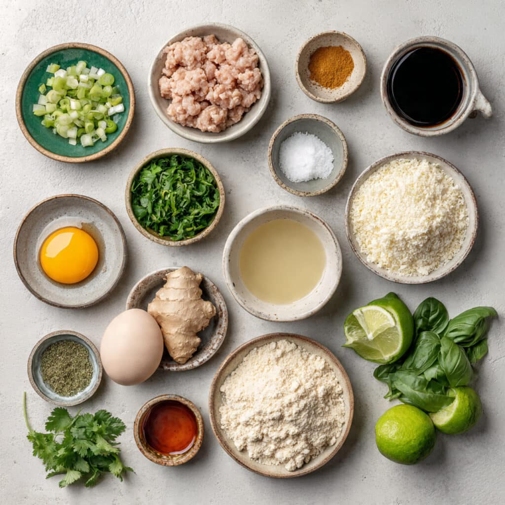 - Combine Ingredients: In a large bowl, mix the ground chicken, panko, egg, half of the minced garlic, half of the grated ginger, green onions, cilantro, salt, and black pepper. Stir gently until just combined, then shape into about 16 to 18 meatballs.