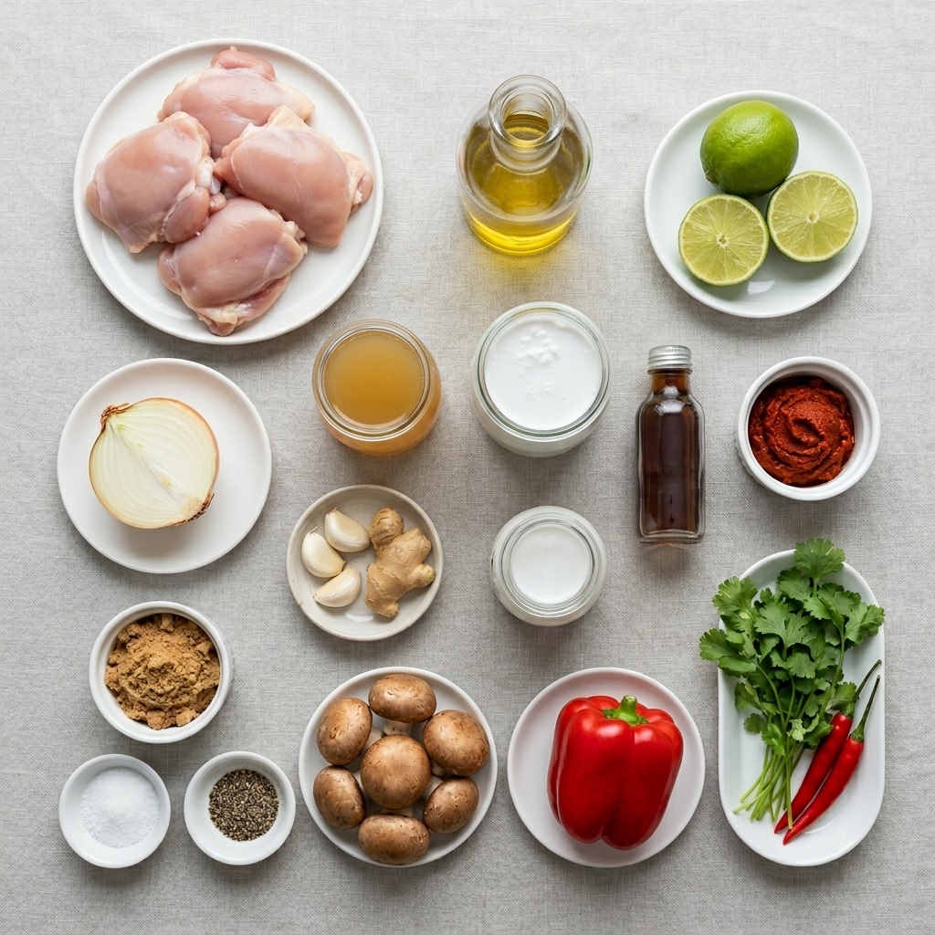 A warm and comforting Thai-inspired coconut broth made with tender chicken thighs, mushrooms, red bell pepper, ginger, garlic, and red curry paste. It is creamy, fragrant, gently spicy, and finished with fresh lime and cilantro for a bright, balanced bowl.