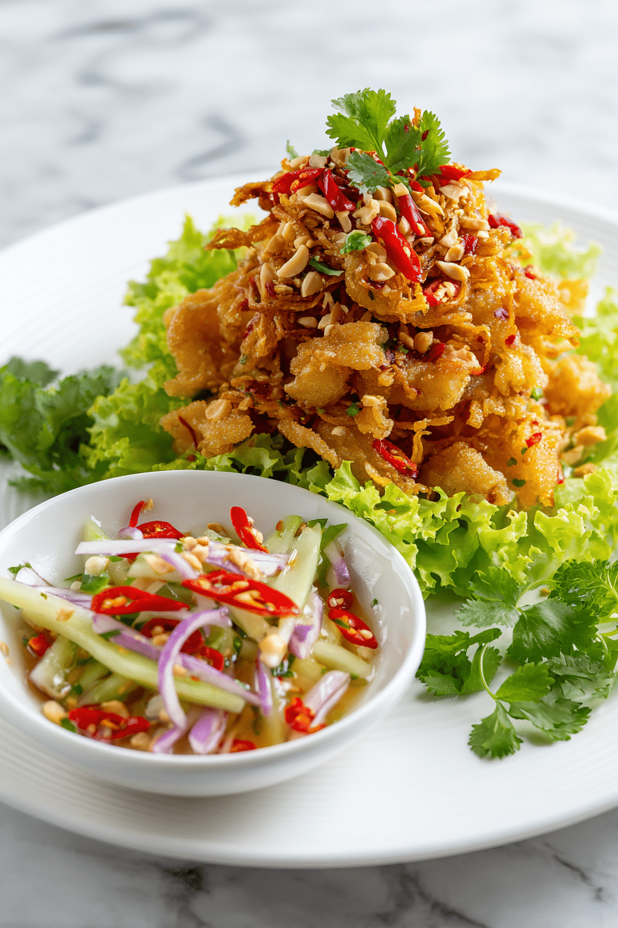 Crispy Catfish and Green Mango Salad is a traditional Thai dish that combines fluffy, golden fried fish with a spicy, tangy, and refreshing green mango salad. It’s a perfect harmony of texture and flavor, ideal as an appetizer or light main course.