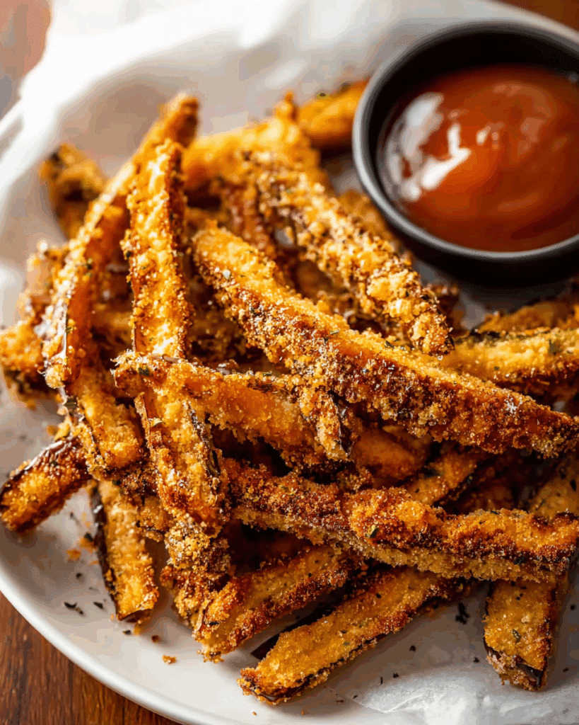 Crispy Eggplant Fries are golden, crunchy on the outside, and tender inside. This easy recipe combines panko, parmesan, and Italian seasoning to create a healthy and delicious alternative to traditional fries, perfect for baking, air frying, or deep frying.