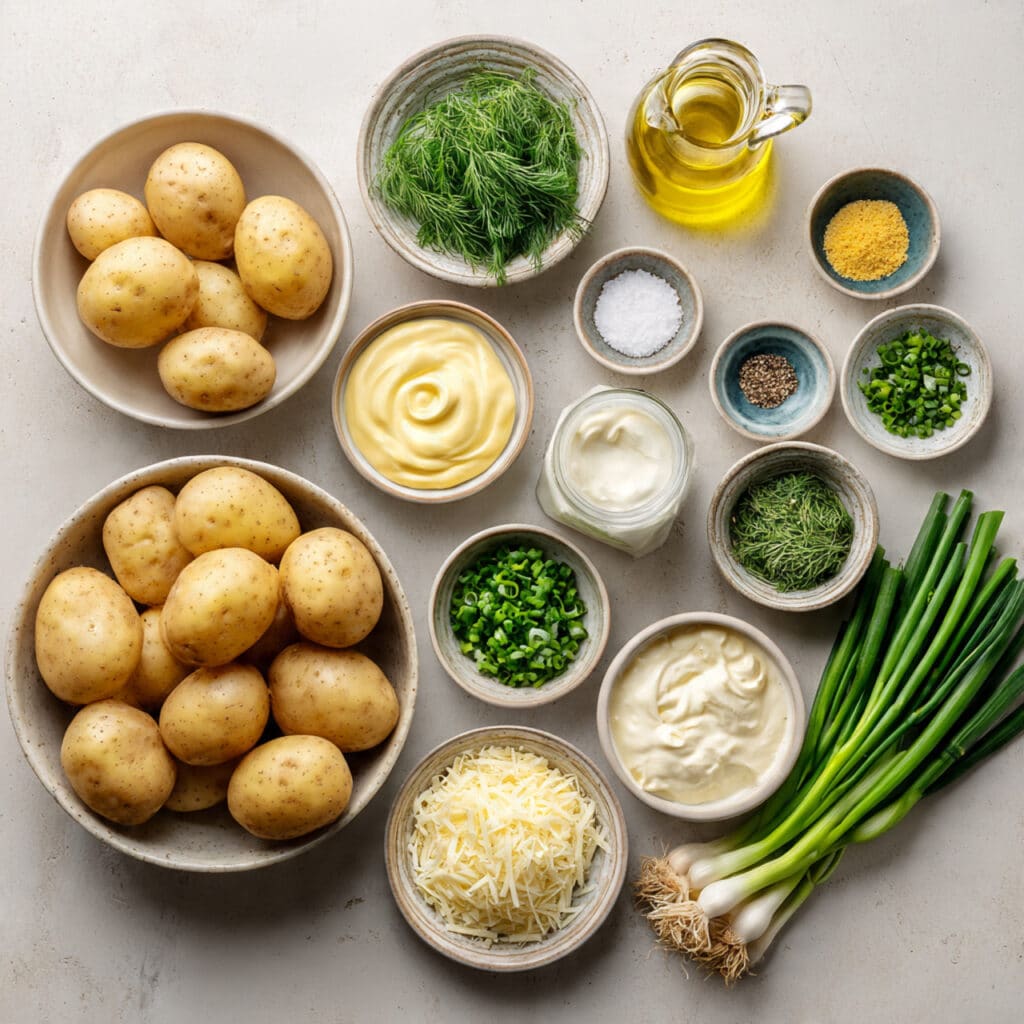 If you are planning ahead, this dish gives you a few very easy options. You can boil the potatoes a day in advance and keep them chilled in the refrigerator. The dressing can also be mixed ahead and stored separately, which makes final assembly much faster.
