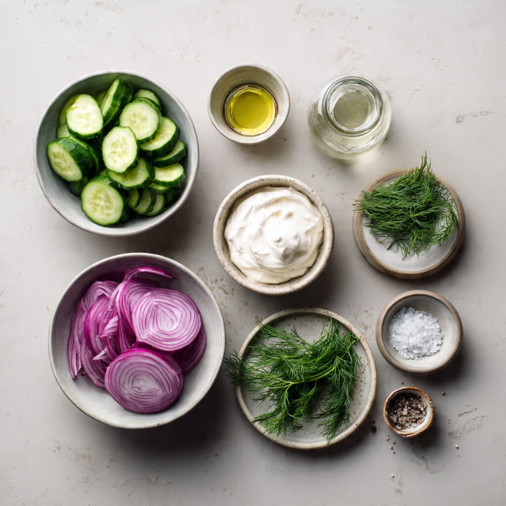 This dish brings together fresh ingredients in the most effortless way. The crispness of cucumber slices blends beautifully with the creamy richness of sour cream, while a hint of herbs lifts everything into something bright and balanced. It is the kind of side dish that quietly steals the spotlight at any table.