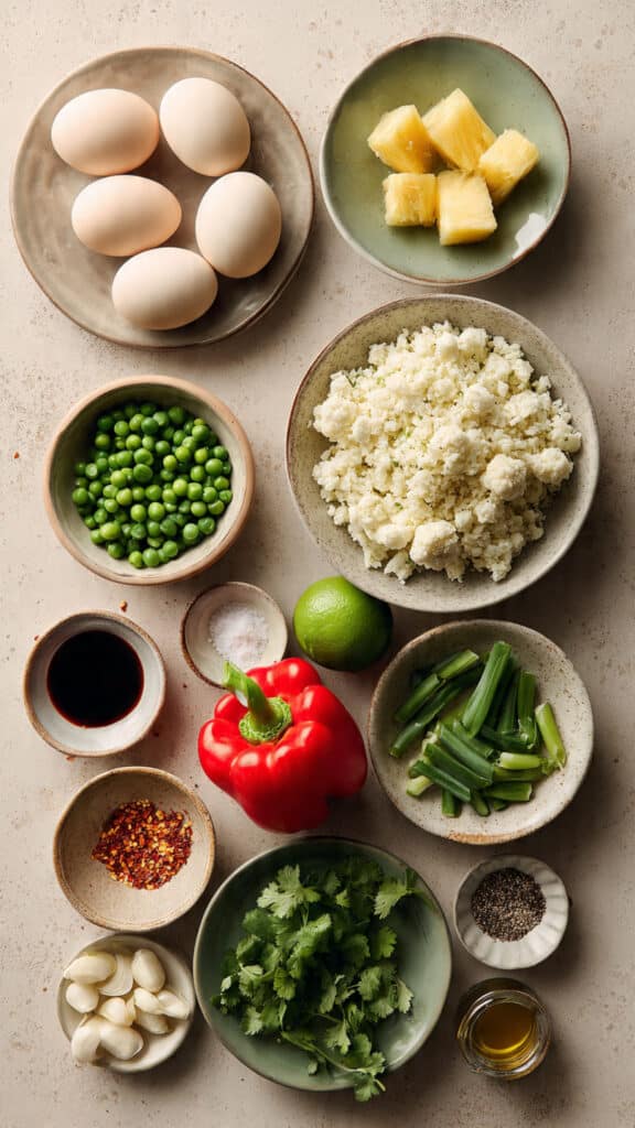 Budget-Friendly: Cauliflower rice, eggs, frozen peas, and basic aromatics keep the cost manageable. A little pineapple goes a long way, so you still get big flavor without needing much.
