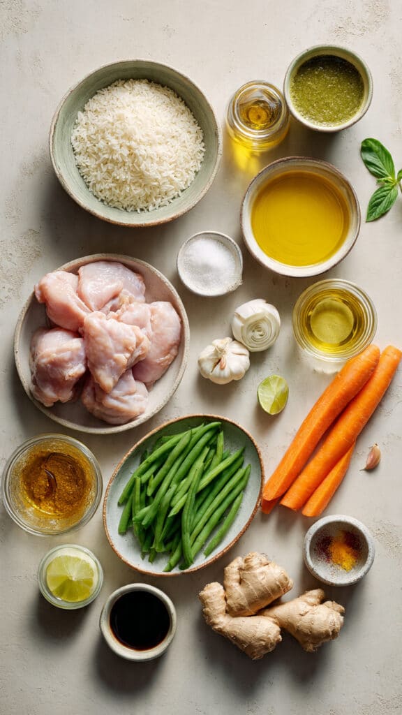 As the rice simmers, it drinks in coconut milk and curry broth, turning soft, creamy, and deeply seasoned. The chicken stays juicy, the carrots add tiny sweet bites, and the green beans bring just enough freshness to keep everything lively.