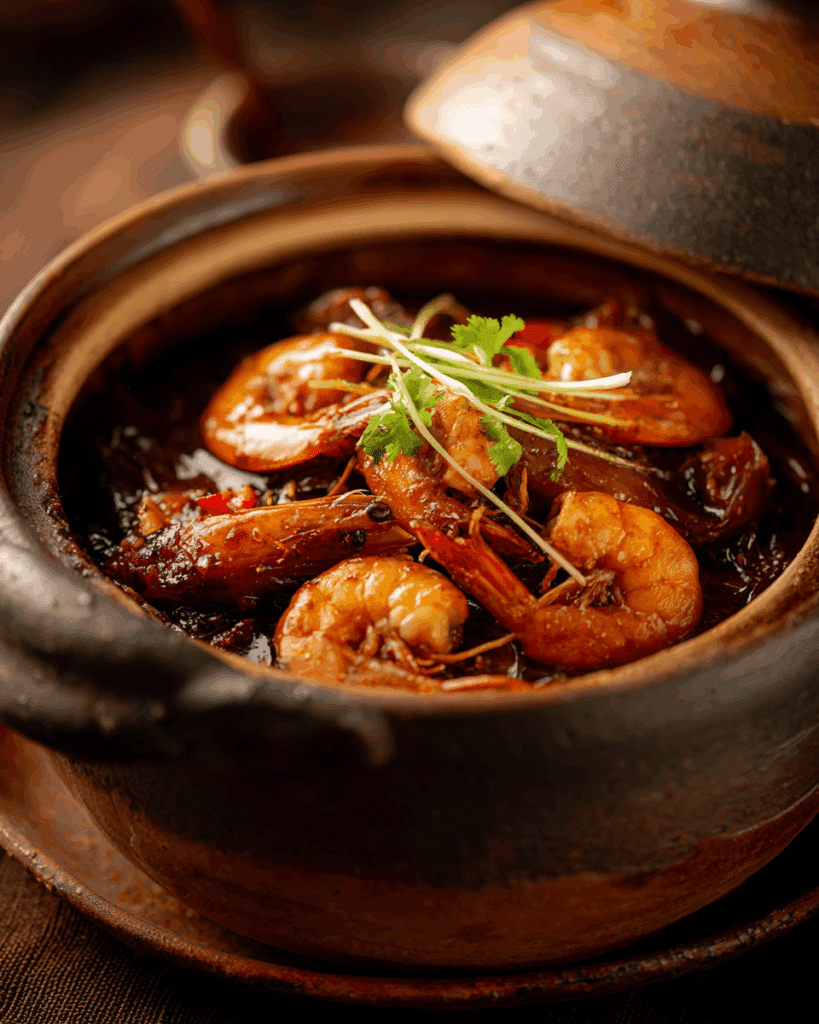 Garnishes should be friendly, not fussy. Fresh cilantro leaves, thin slices of scallion, and a dusting of white pepper are enough. A wedge of lime on the plate adds a clean finish that lifts the soy and oyster sauce notes in Shrimp and Noodle Clay Pot.