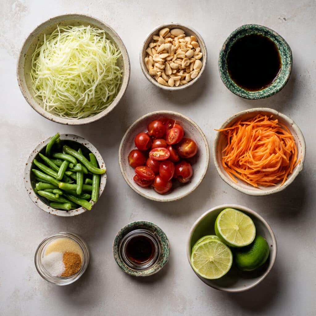 A fresh and vibrant Thai green papaya salad packed with crisp vegetables, tangy lime, and a hint of sweetness.