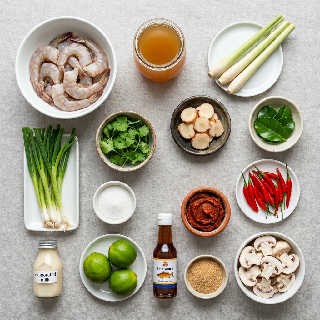 A bold and comforting Thai soup with juicy shrimp, mushrooms, fragrant lemongrass, galangal, lime leaves, and a hot sour broth finished with evaporated milk for a silky touch.