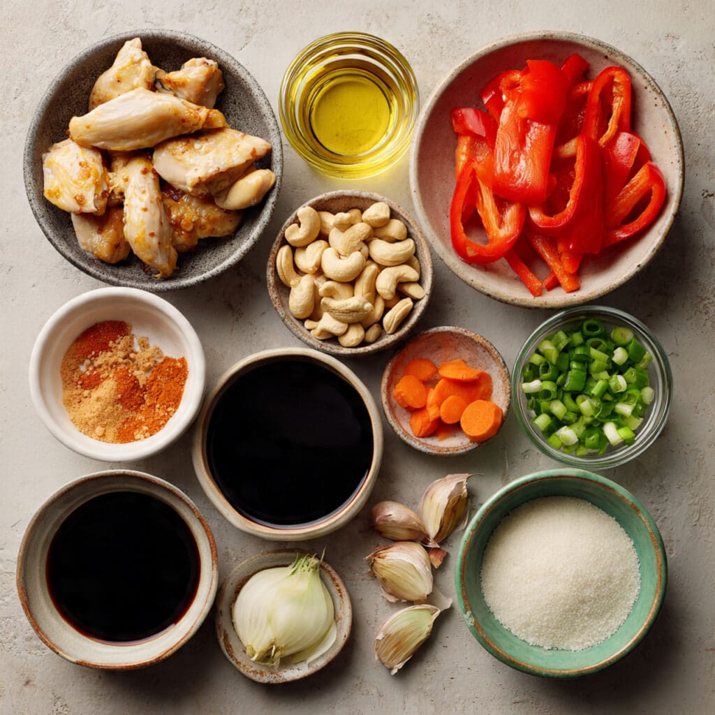 Cashew Nuts: These provide a buttery crunch that contrasts beautifully with the tender chicken and glossy sauce.