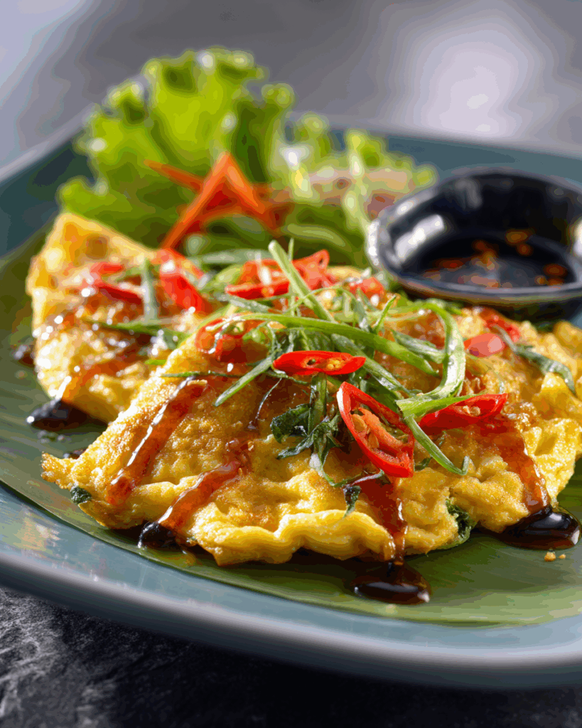 This omelette is not often found on restaurant menus outside Thailand, but inside the country, it’s beloved. Street vendors sell it as a quick, affordable meal, often served with rice and spicy dips. In rural villages, it’s cooked at home almost daily, especially in central and northeastern Thailand.