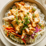 Thai Chicken Rice Bowl is a meal that brings comfort and freshness together in one vibrant dish. The combination of fluffy rice, savory chicken, crisp vegetables, and creamy sauce creates a bowl that feels satisfying and balanced.