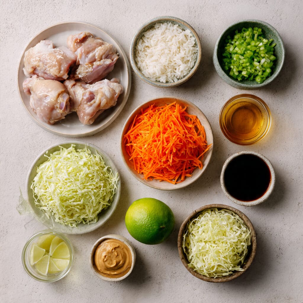 A flavorful Thai inspired rice bowl with tender chicken, fluffy jasmine rice, fresh vegetables, and a creamy peanut sauce that brings everything together.