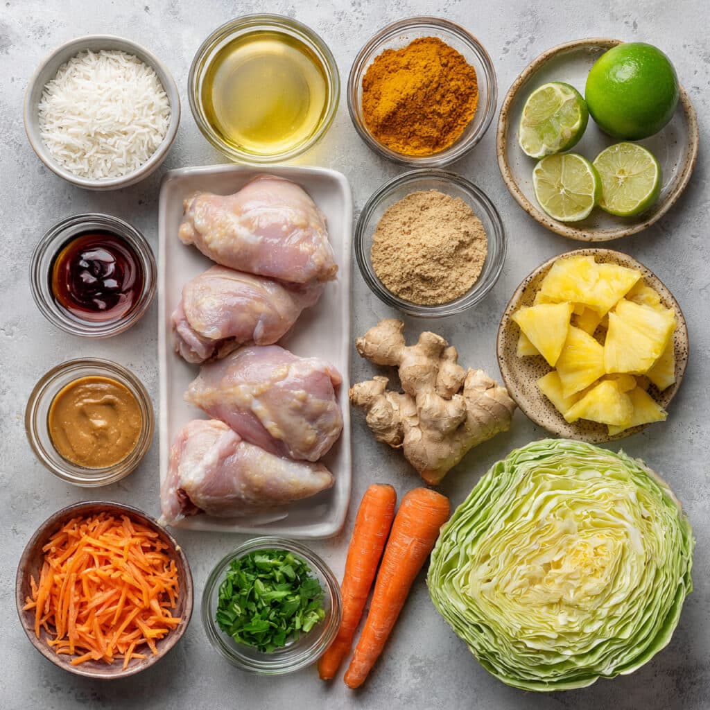 Now let’s dive into the ingredients, because this is where the flavor story really starts to build. Every part of this dish has a job to do, from the coconut milk that keeps the chicken tender to the pineapple that adds juicy brightness.