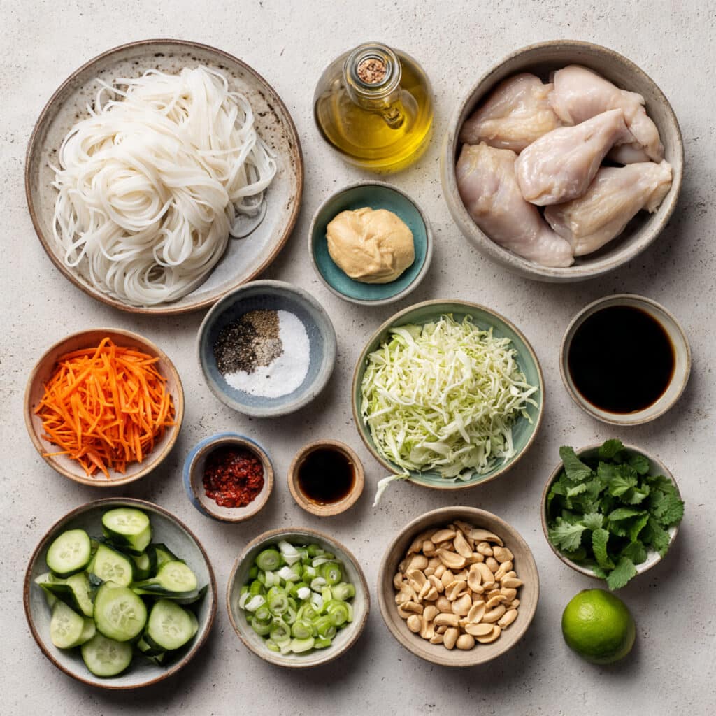 A fresh and satisfying noodle salad made with tender chicken, silky rice noodles, crunchy vegetables, fragrant herbs, and a creamy coconut peanut dressing with bright lime flavor.