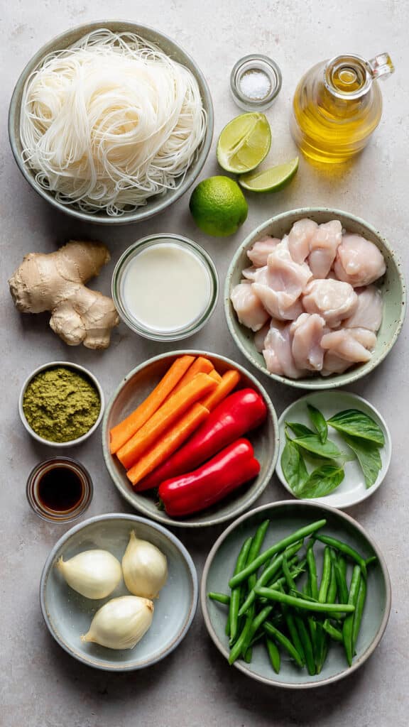 A cozy Thai-inspired green curry noodle soup with tender chicken, rice noodles, crisp vegetables, coconut milk, herbs, and a bright lime finish.