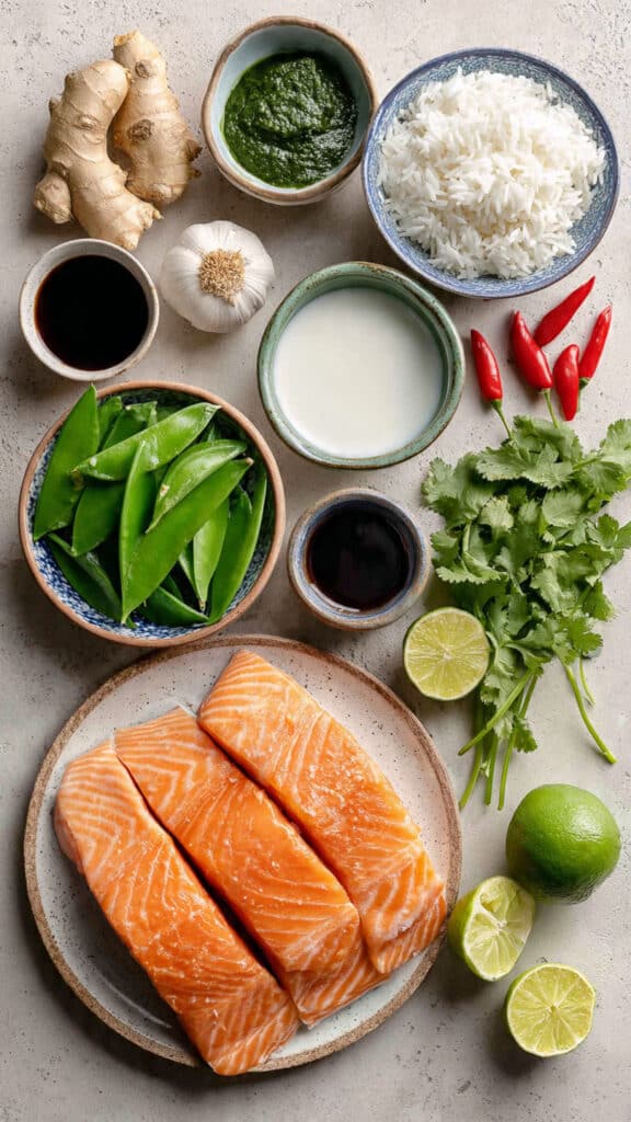Keywords: green curry salmon, coconut curry salmon, salmon curry, Thai-inspired dinner, easy salmon recipe