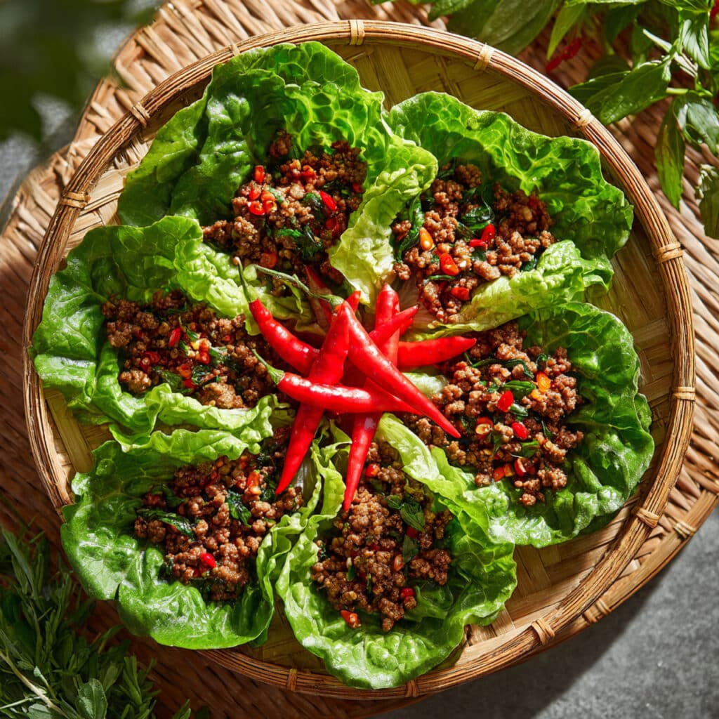 A fresh and flavorful Thai-inspired dish made with gently cooked ground beef, bright lime juice, aromatic herbs, and crisp lettuce leaves, perfect for a light yet satisfying meal that balances savory, spicy, sweet, and sour notes.