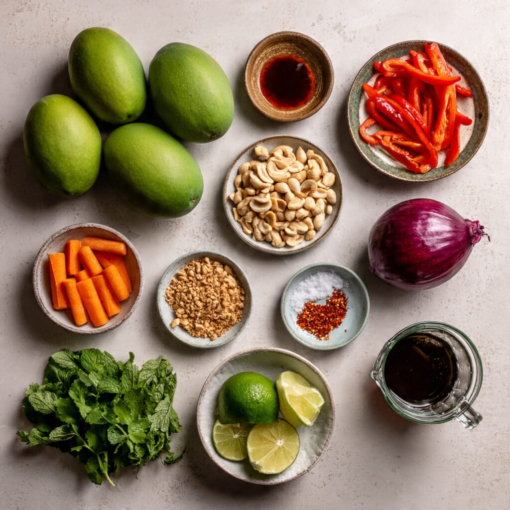 - Green mangoes: 2 large green mangoes, peeled and julienned, these bring the tart crunch that defines the dish and gives it that refreshing snap.