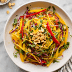 This vibrant mango dish stands out because it brings together all the essential elements of Thai cuisine in one bowl. The unripe green mango delivers a tangy punch, while fresh herbs, spicy chili, and crunchy nuts create layers of flavors and textures that keep your taste buds excited. Unlike many salads, this Thai favorite never feels boring. Each bite offers something new—sweetness from the maple syrup, heat from the chili, and zestiness from the lime juice.