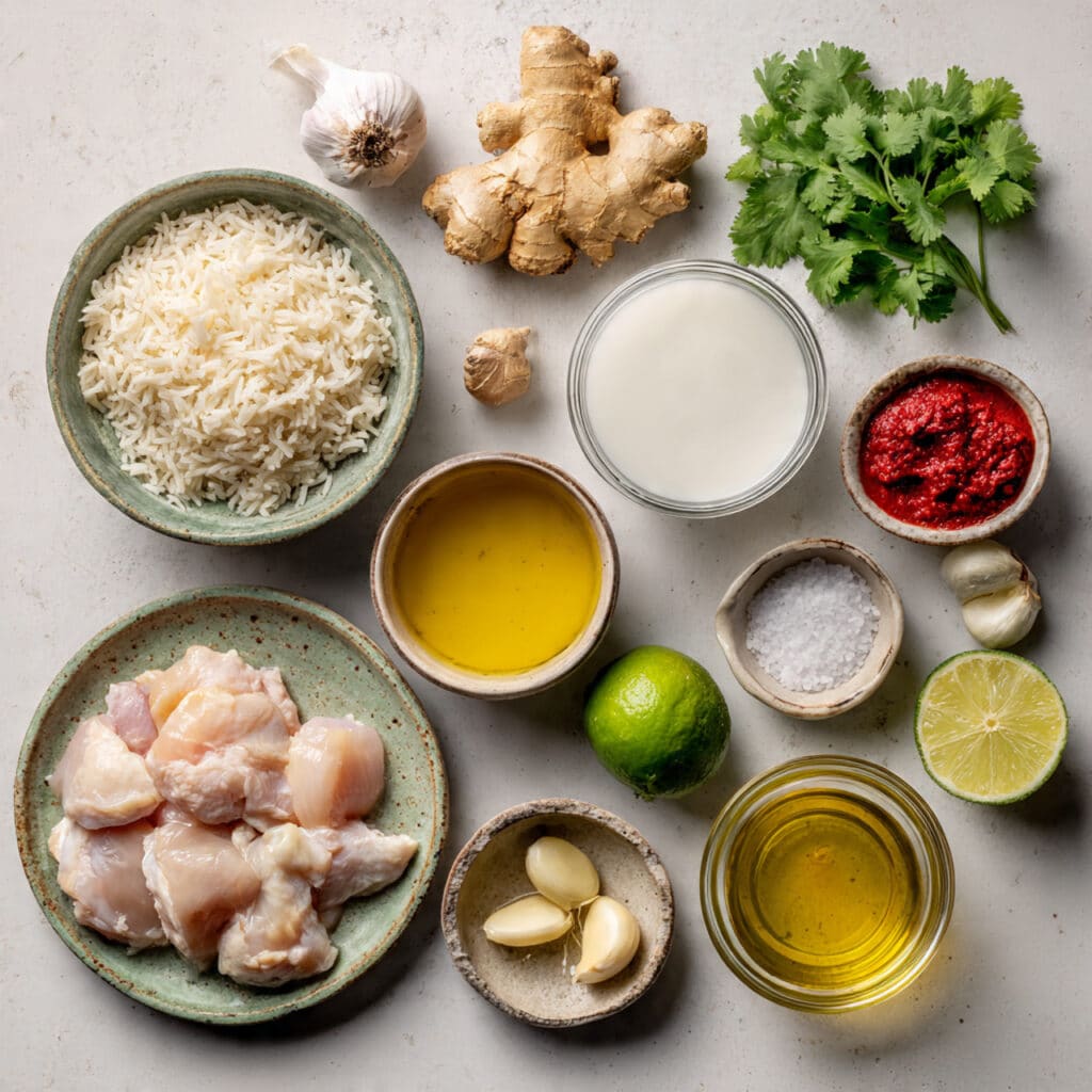 A comforting bowl of creamy coconut broth, tender chicken, and fragrant rice infused with Thai red curry flavors.