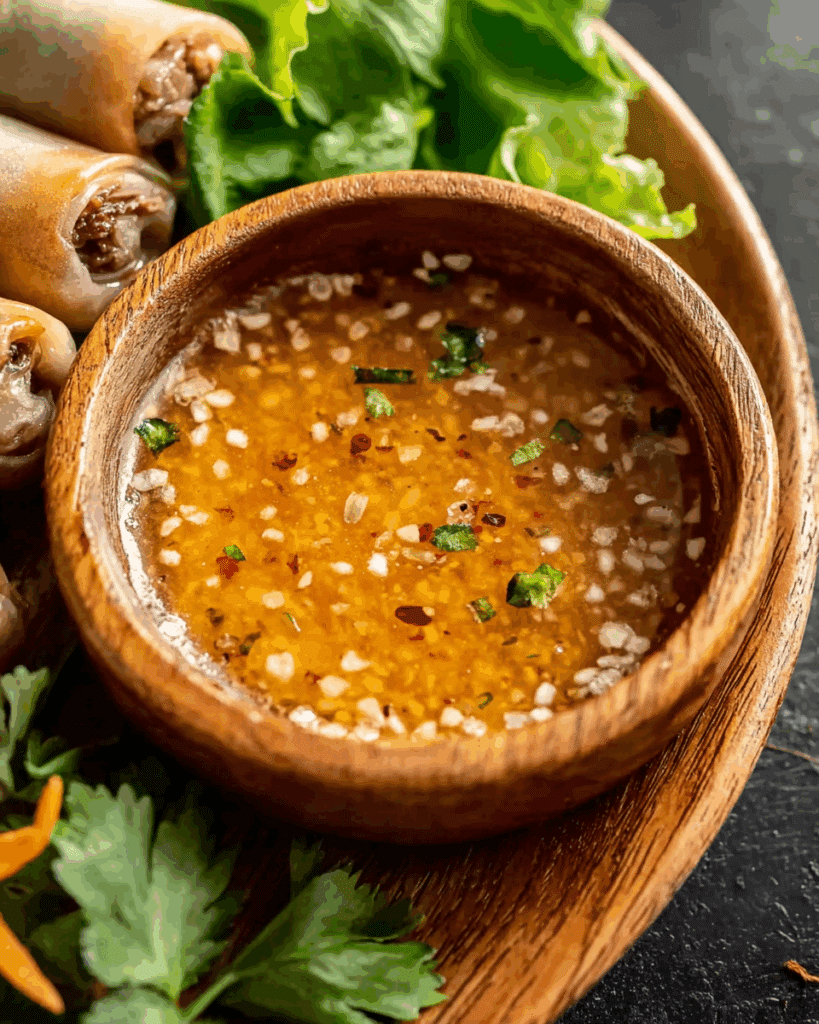 One of the best ways to serve this sauce is with fried rolls that come straight out of the pan. The warm, crunchy wrapper grabs the liquid gently, and the flavors settle into the small cracks of the roll which makes each bite feel satisfying and comforting. If you prefer lighter meals, you can pair the sauce with fresh rolls packed with herbs, vegetables, and noodles. The cool temperature of fresh rolls makes the sauce feel sharp and refreshing which creates a nice balance.