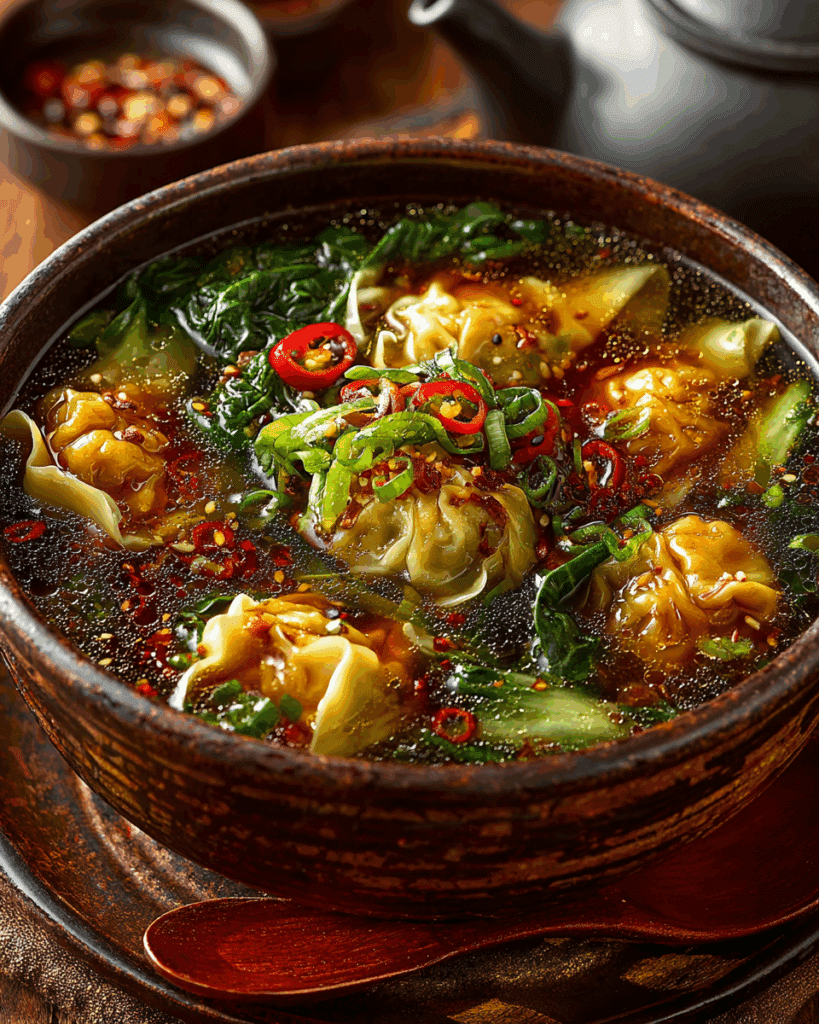 Thai food almost always has layers of flavor. Even a simple soup is rarely just salty or just spicy. That is why garnish matters. After ladling your soup, top it with green onions and a pinch of white pepper, which brings gentle heat that lingers in your throat. If you like spice, a sprinkle of chili flakes or a spoon of chili oil on top can turn a standard broth into something very close to a Thai red curry wonton soup feeling, without actually adding curry paste.